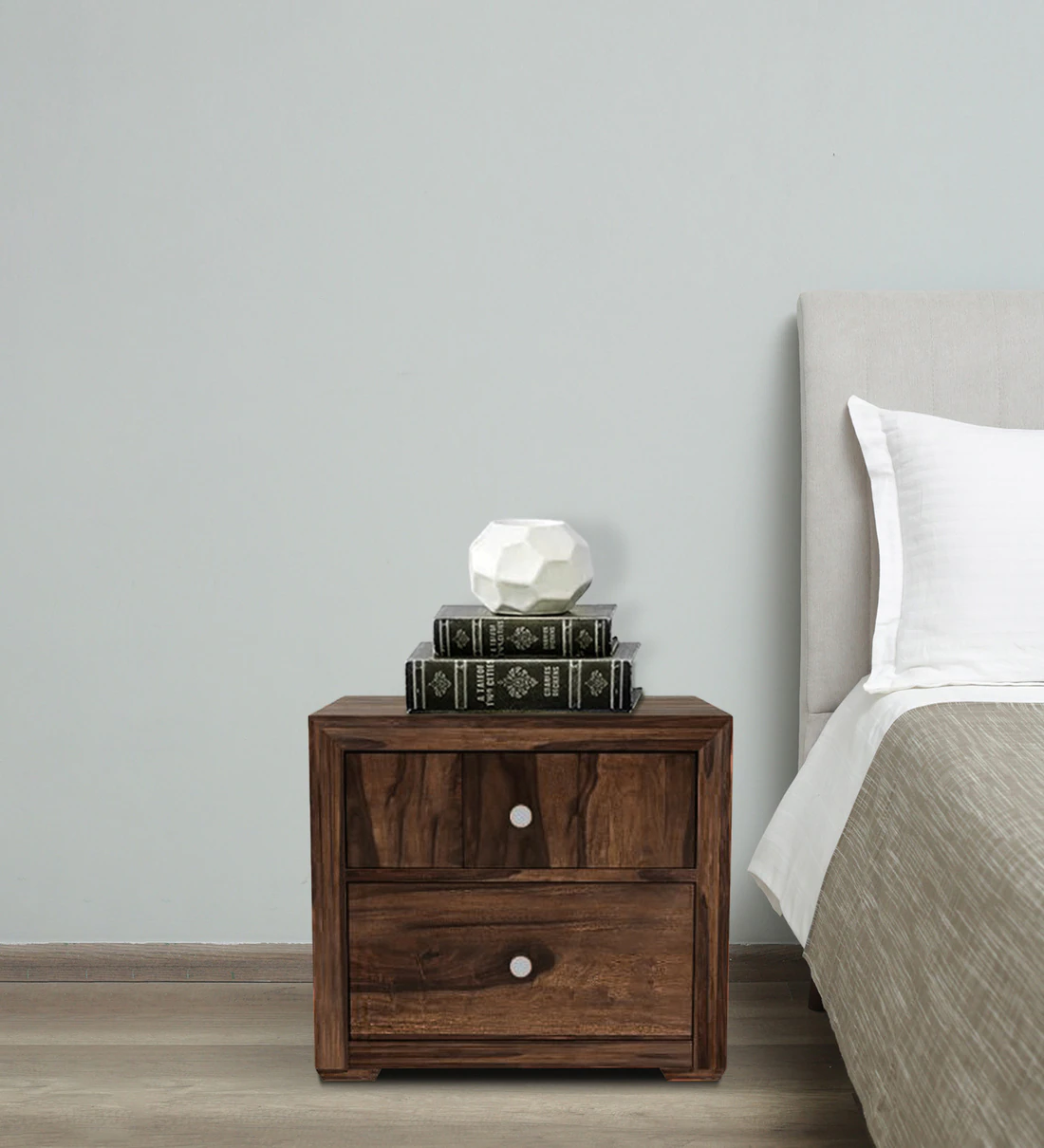 Modern Sheesham wood bedside table with soft-close drawers and sleek designModern Sheesham Bedside Table with Soft-Close Drawers and Sleek Look