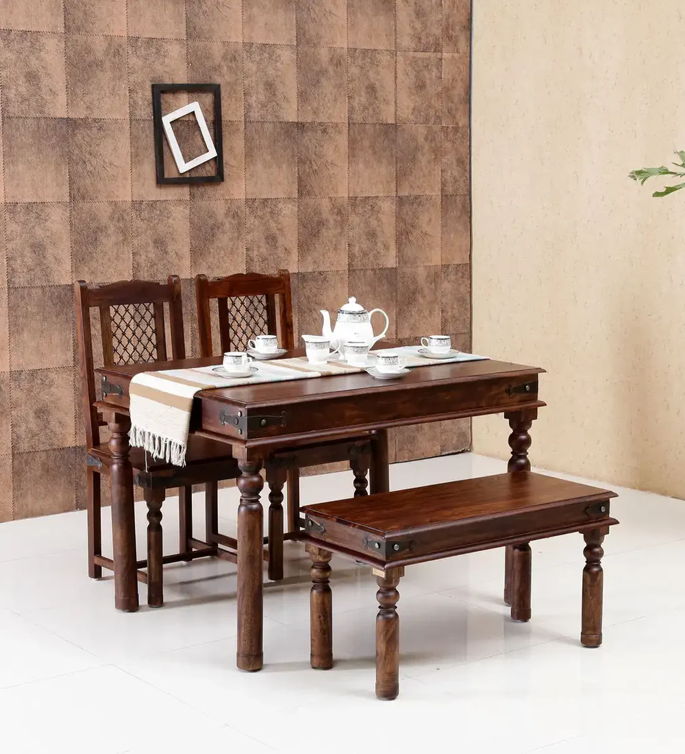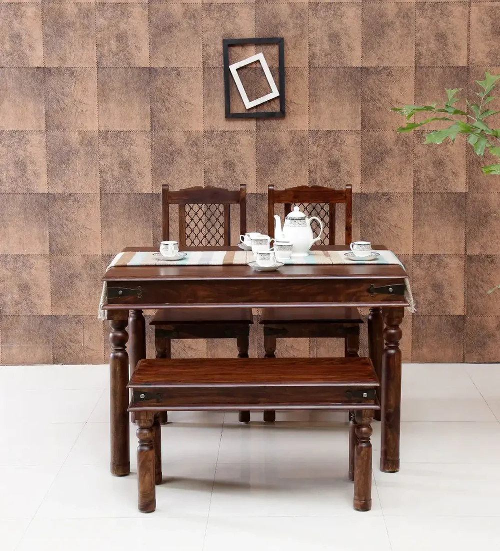 Explore a wooden compact dining set with space-saving benches and an expandable table design. Ideal for modern homes with flexible seating needs.