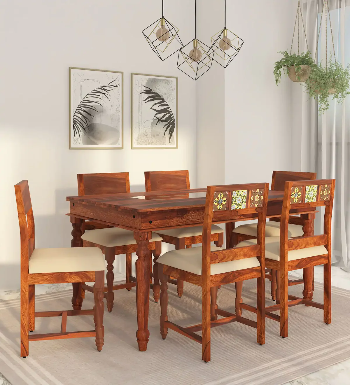 Add a touch of sophistication to your dining room with thisย Teak Dining Set, crafted from premium solid wood and featuring cushioned seating and an artistically carved wooden frame.