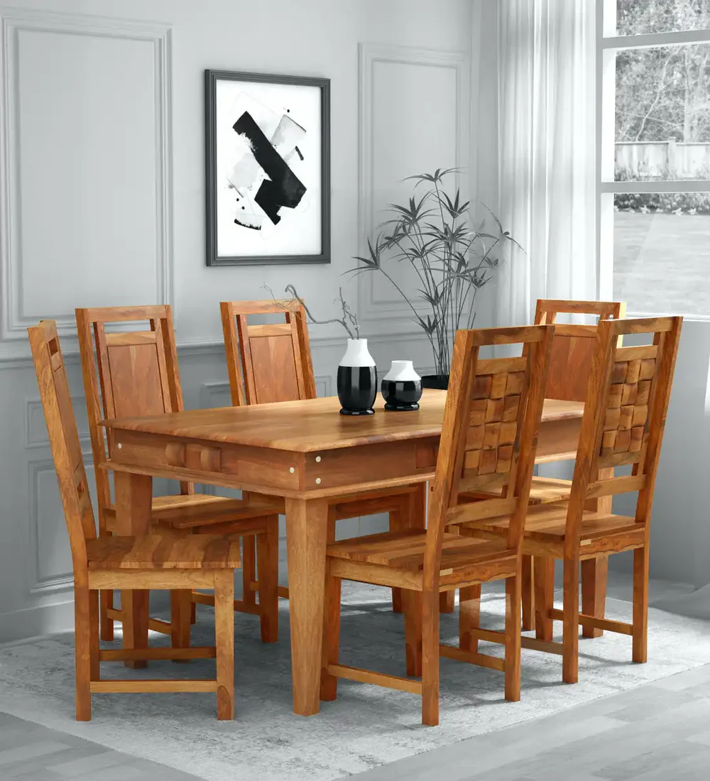 Choosing a solid sheesham wood 6 seater dining set adds warmth and style to your home. With its natural resistance to wear and tear, you can trust this investment will serve you well for years, providing the ideal setting for memorable meals.
