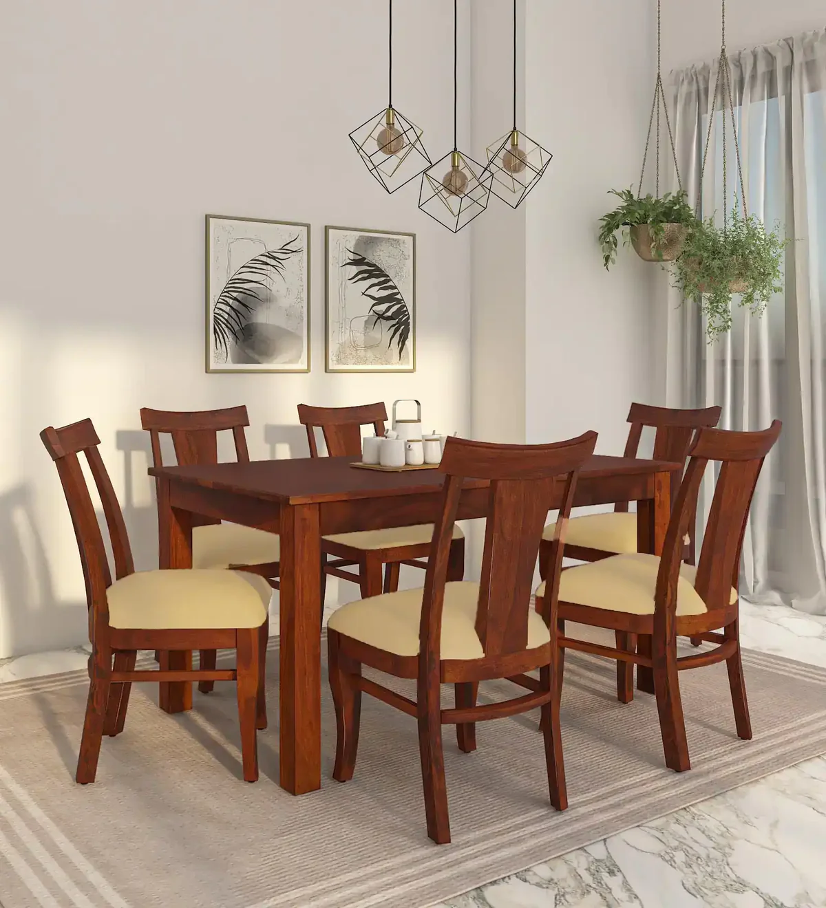 Bring timeless elegance to your dining space with this Sheesham wooden dining set. Crafted from premium wood, the polished table showcases natural grain and a smooth finish that enhances its classic look. The set includes comfortable seating designed for long family meals and gatherings. Durable and sturdy, this dining set combines traditional craftsmanship with practical comfort, making it an ideal centerpiece for any home that values both style and function.