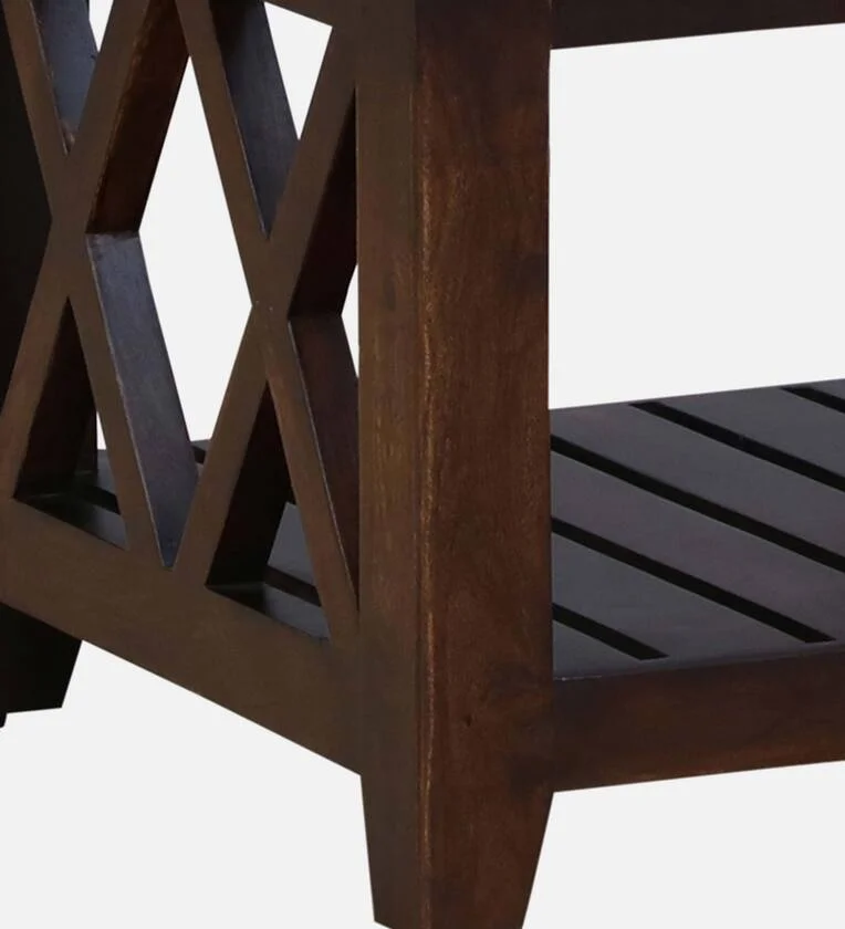 Stylish coffee table in wood featuring a built-in storage basket and polished finish.Designer Wooden Coffee Table with Storage Basket and Smooth Finish For Online