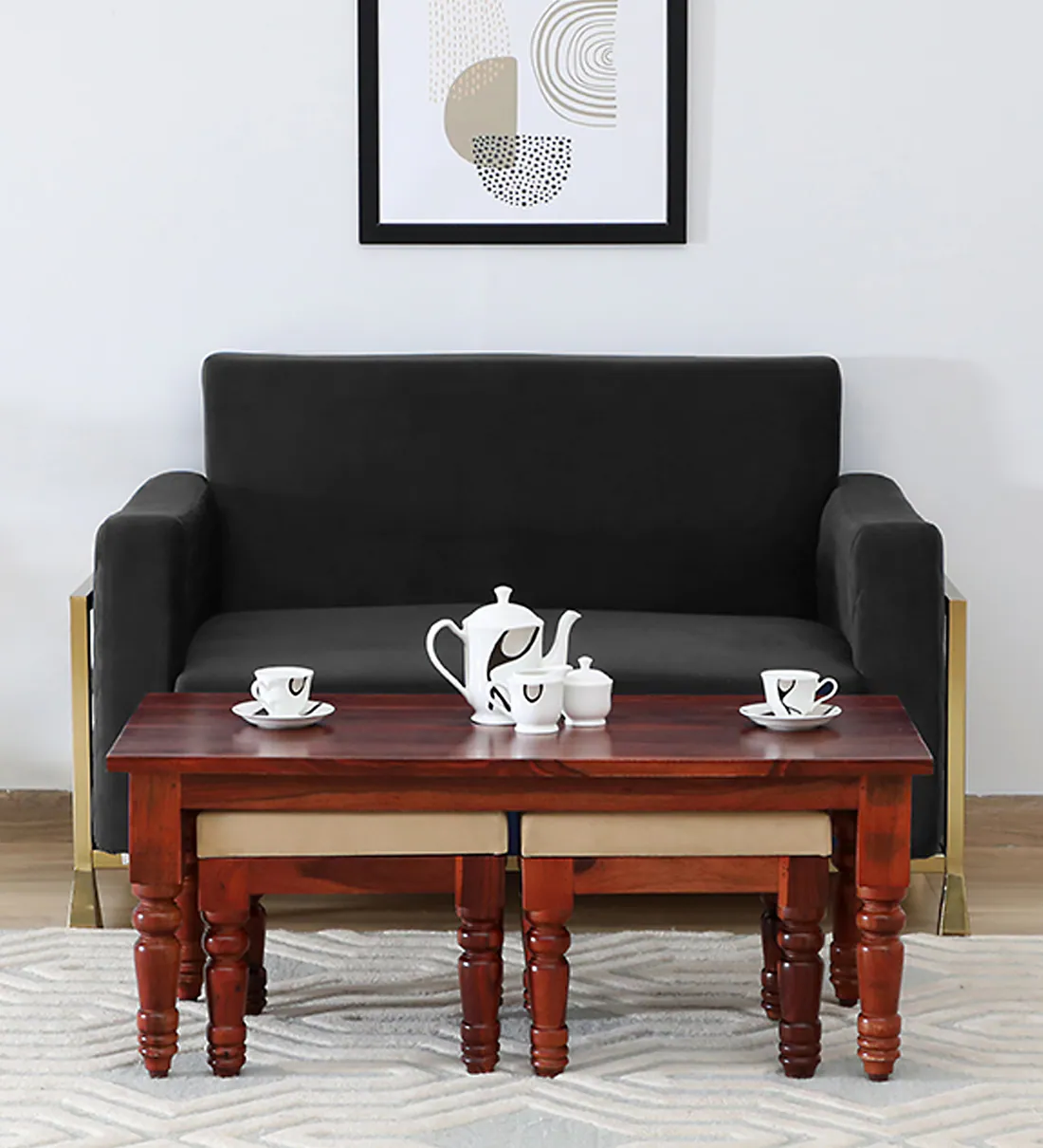 This nesting table set includes two matching stools, making it a versatile addition to any living room or lounge area. The nesting design offers unmatched convenience, allowing you to save space when the stools are not in use or easily pull them out for extra seating when entertaining guests. The warm tones of Sheesham wood not only enhance the aesthetic appeal but also ensure durability for years to come.