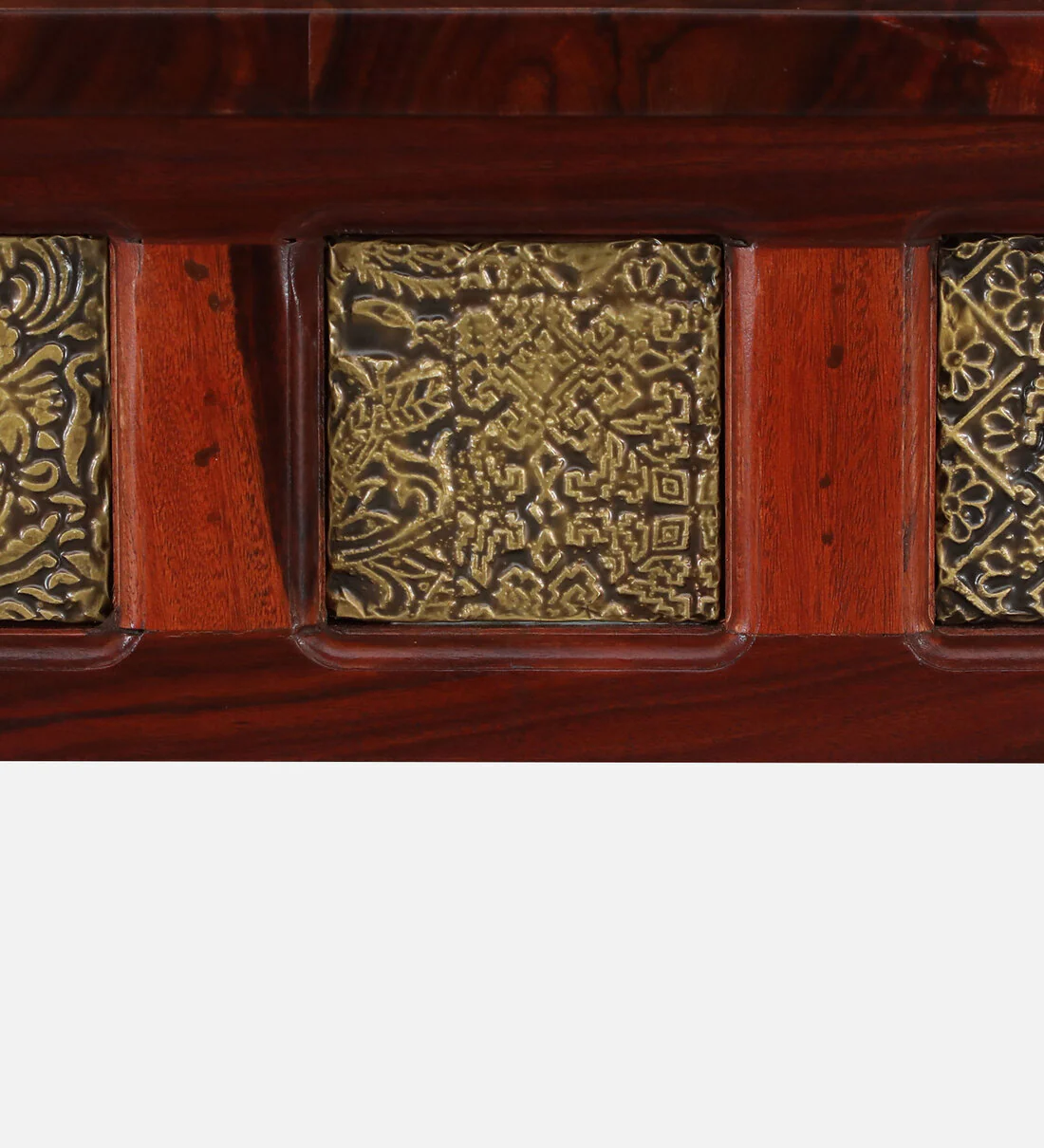 The intricate brass cladding on the tabletop and stool frames brings an elegant, antique feel. It highlights the craftsmanship and creates a bold visual impact that suits both modern and traditional interiors.by wooden furniture in Maharashtra.