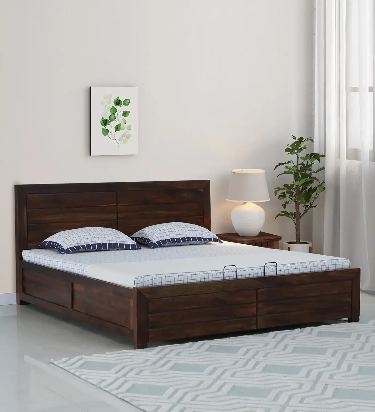 Transform your bedroom into a sanctuary of elegance and functionality with the Coverings Indian Rosewood Bed featuring hydraulic storage by Sarve Furniture. This meticulously crafted bed combines traditional craftsmanship with modern design, offering you both style and practicality.