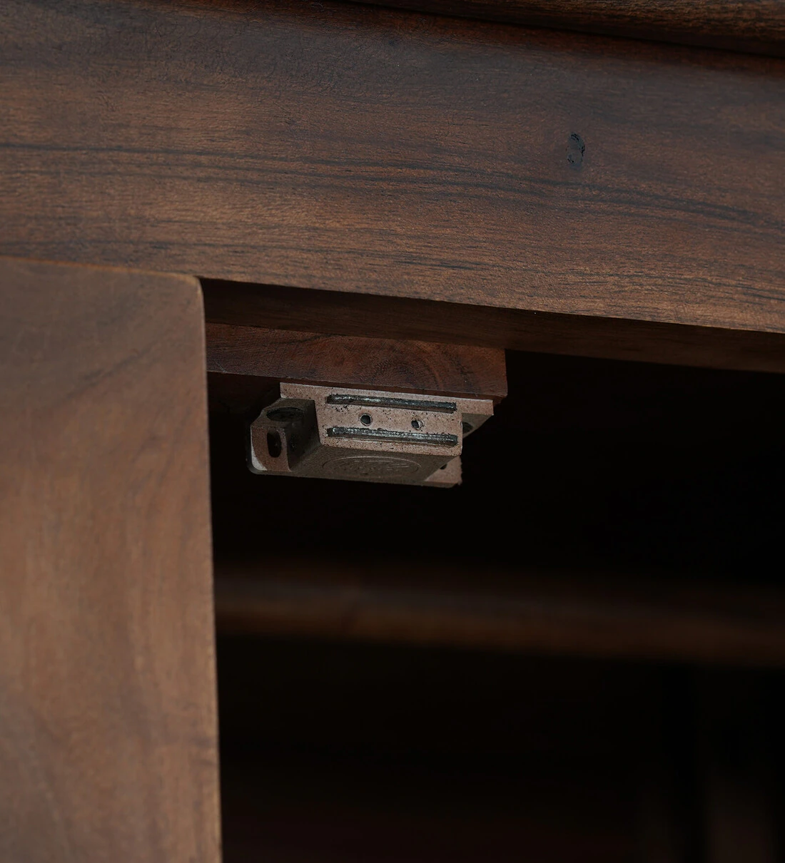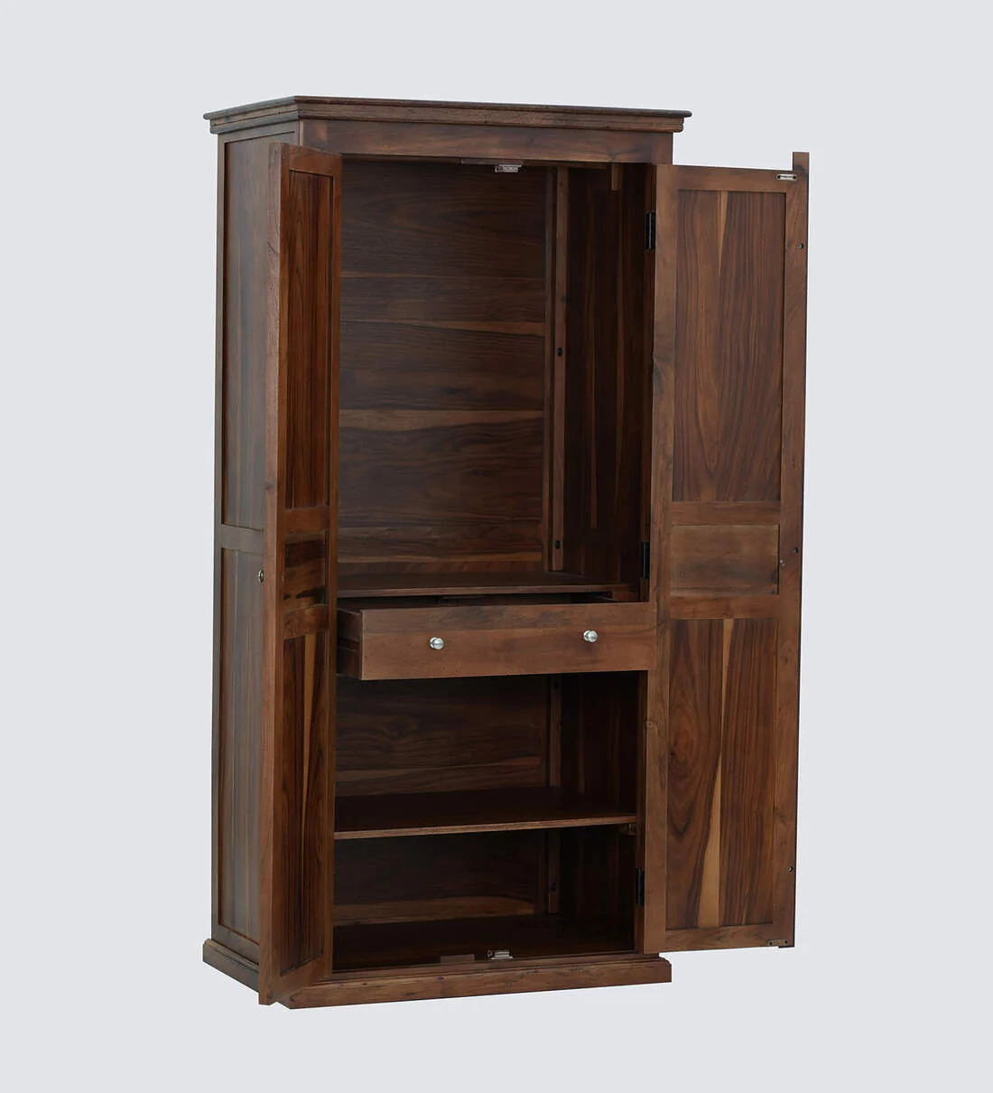 This double-door wardrobe offers generous storage with well-organized shelves, hanging space, and compartments. Whether you’re storing clothes, accessories, or extra linens, its tall build helps maximize vertical space in your room. Strong hinges and sturdy shelves ensure lasting performance, while the Sheesham wood texture adds a touch of sophistication.